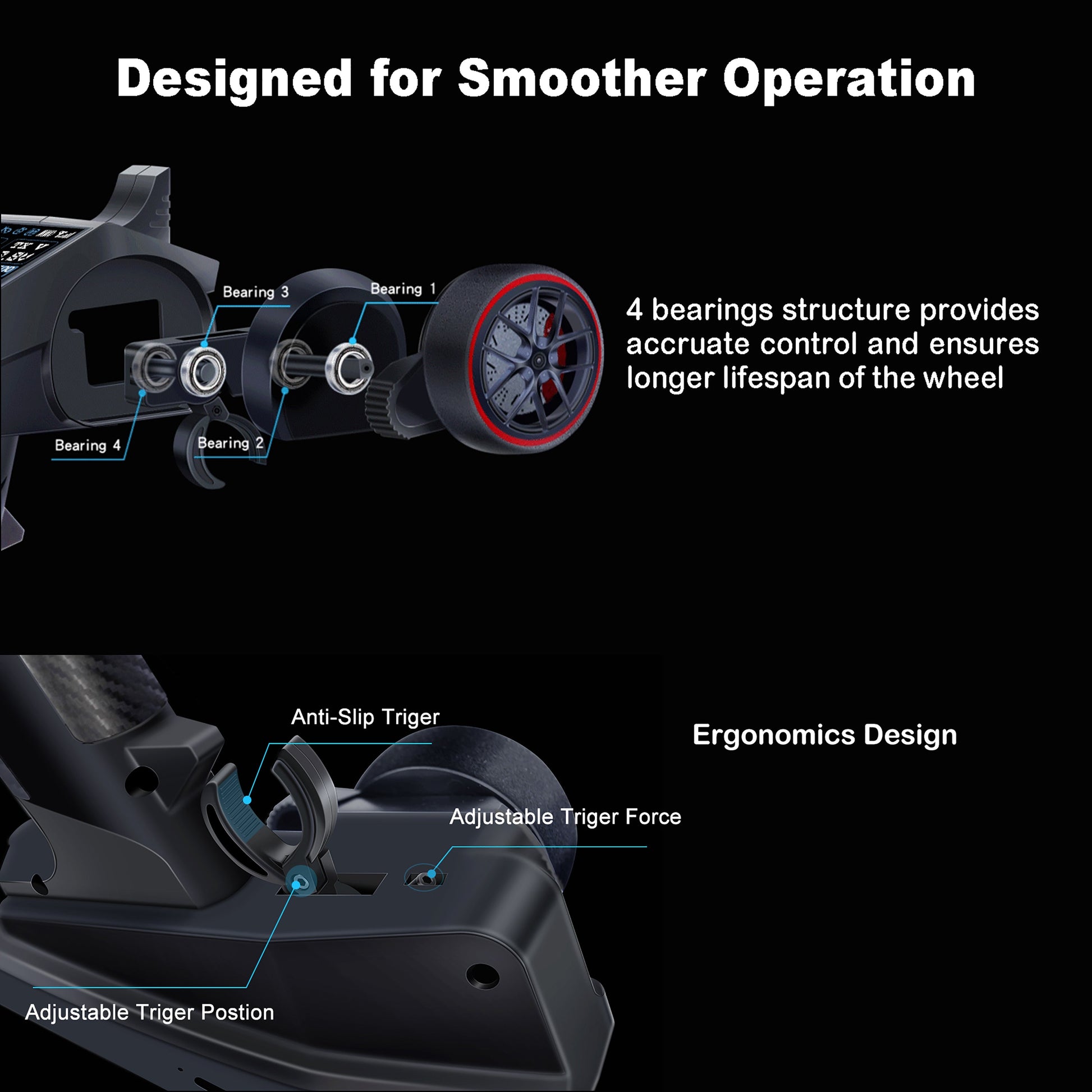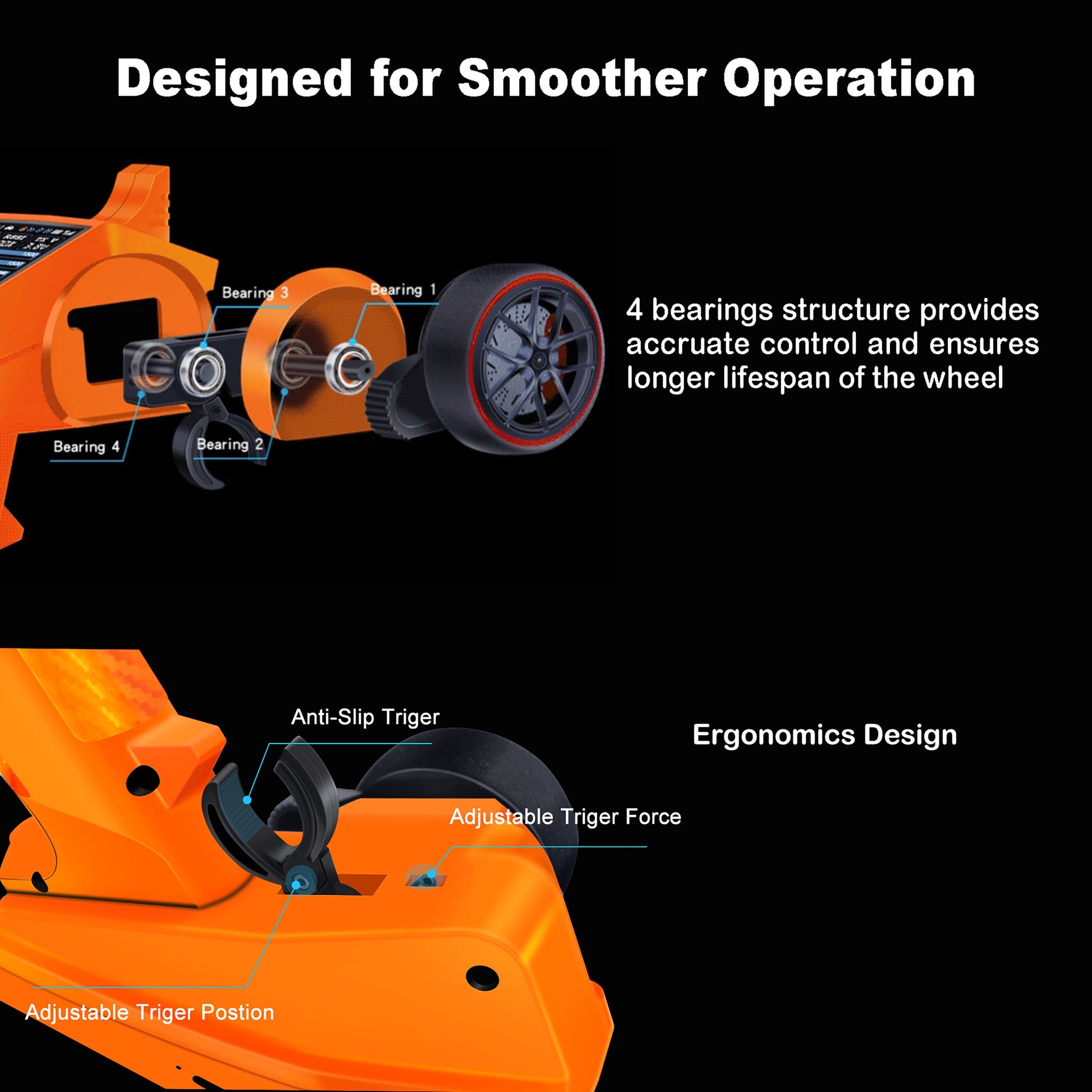 - 【User-friendly and Ergonomics Design】(1) Comes with lock function to avoid misoperation, 15s auto-off function, and it's rechargeable; (2) The 4-bearing structure wheel and the anti-slip trigger with adjustable force and position ensure smoother and accurate operation.