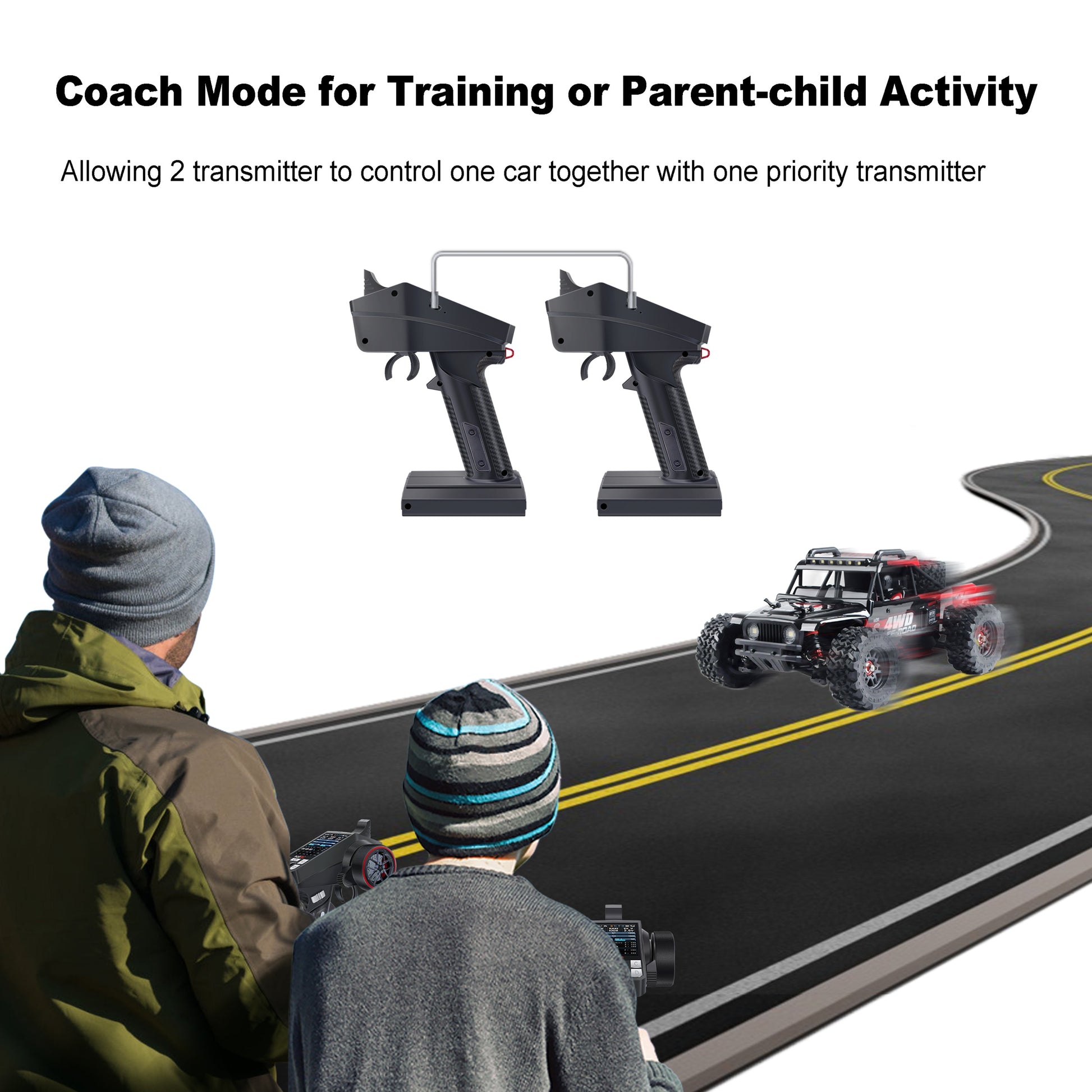 - 【Coach Mode】Allows two transmitters to control one car together with one priority transmitter to complete some training work or interesting parent-child activities.