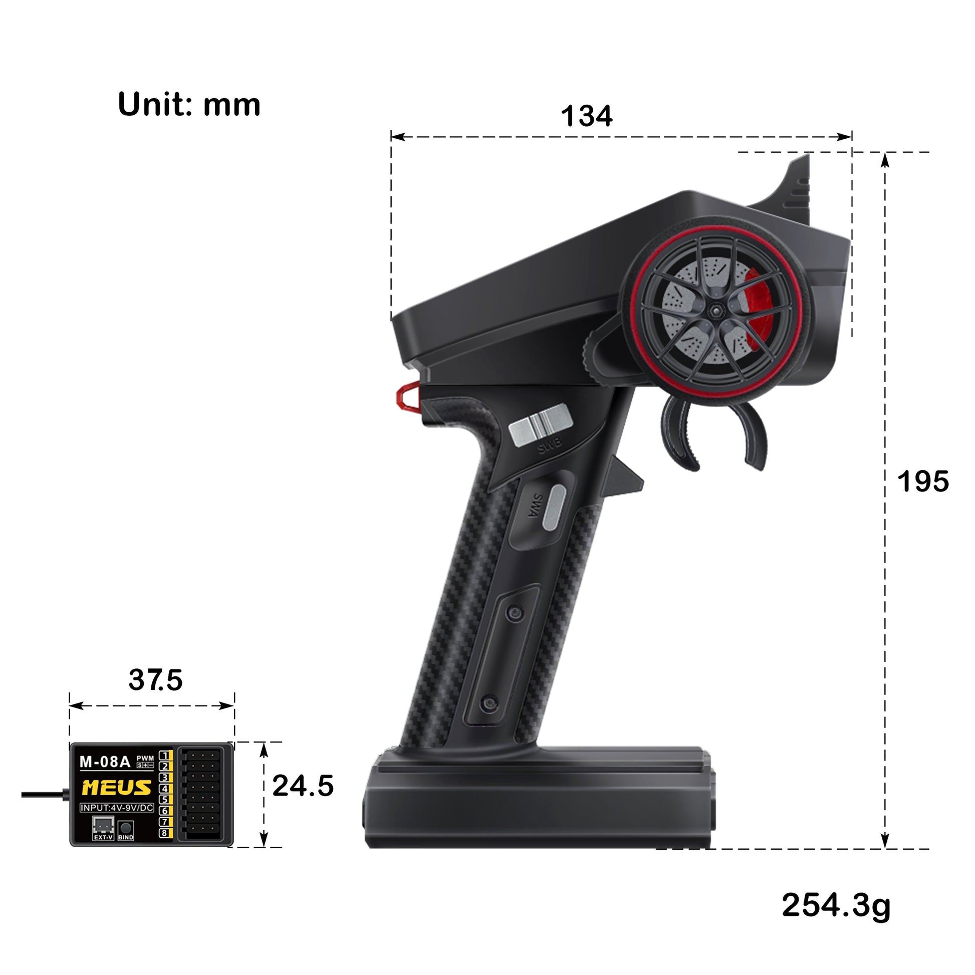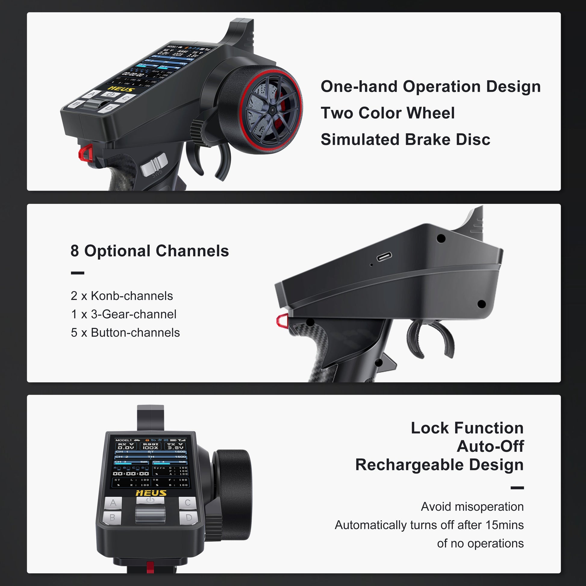 MEUS Racing ME-8A 8CH 2.4GHz RC Transmitter with M-08A Receiver for 1/24 SCX24 1/18 TRX4M 1/10 SCX10 TRX-4 RC Models.