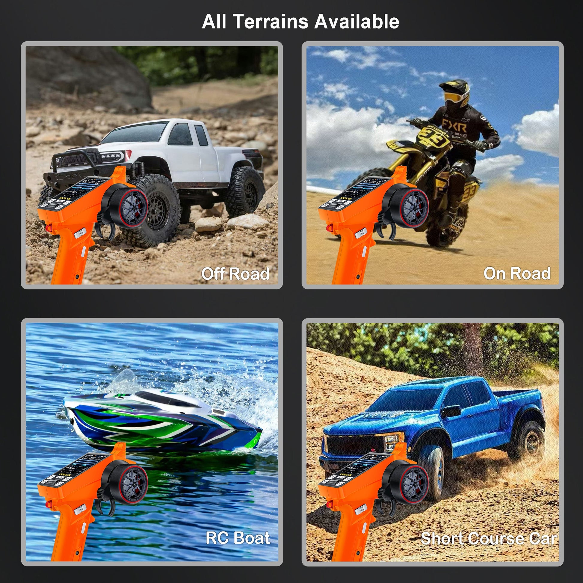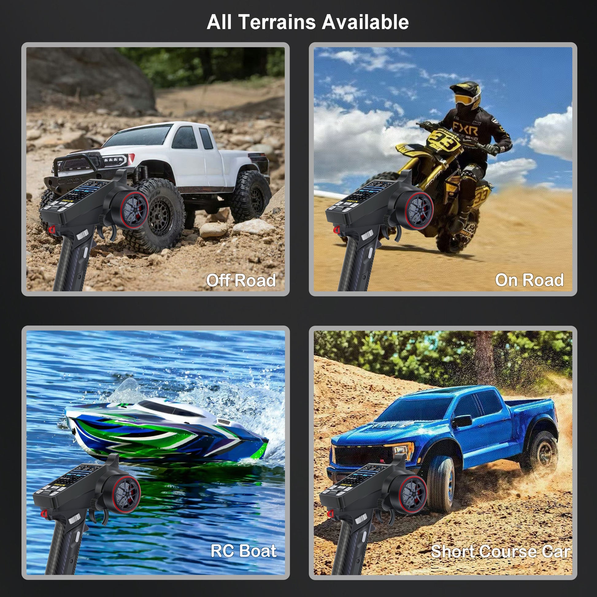 - 【All Terrains Available】This RC transmitter and receiver kit can be used for off-road, on-road use, e.g., RC crawler, RC short course car, RC boat, RC motorcycle, etc., and various scale models, e.g., 1/5, 1/8, 1/10, 1/18, 1/24 scales.